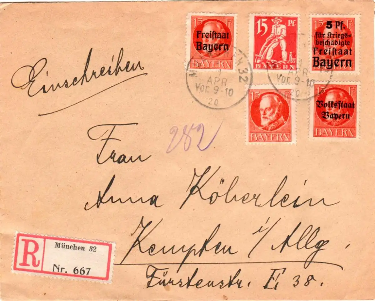 Bayern 1920, 5 versch. 15 Pf. auf Einschreiben Brief v. München 32