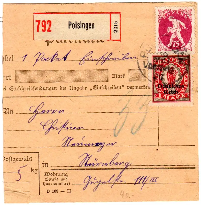 Bayern 1920, 75 Pf. Abschied+1 Mk. DR auf Einschreiben Paketkarte v. Polsingen