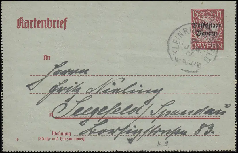 Bayern Cartes-lettres devant la page K9 Volksstaat 15 Pf PETITERFELD 27.6.19