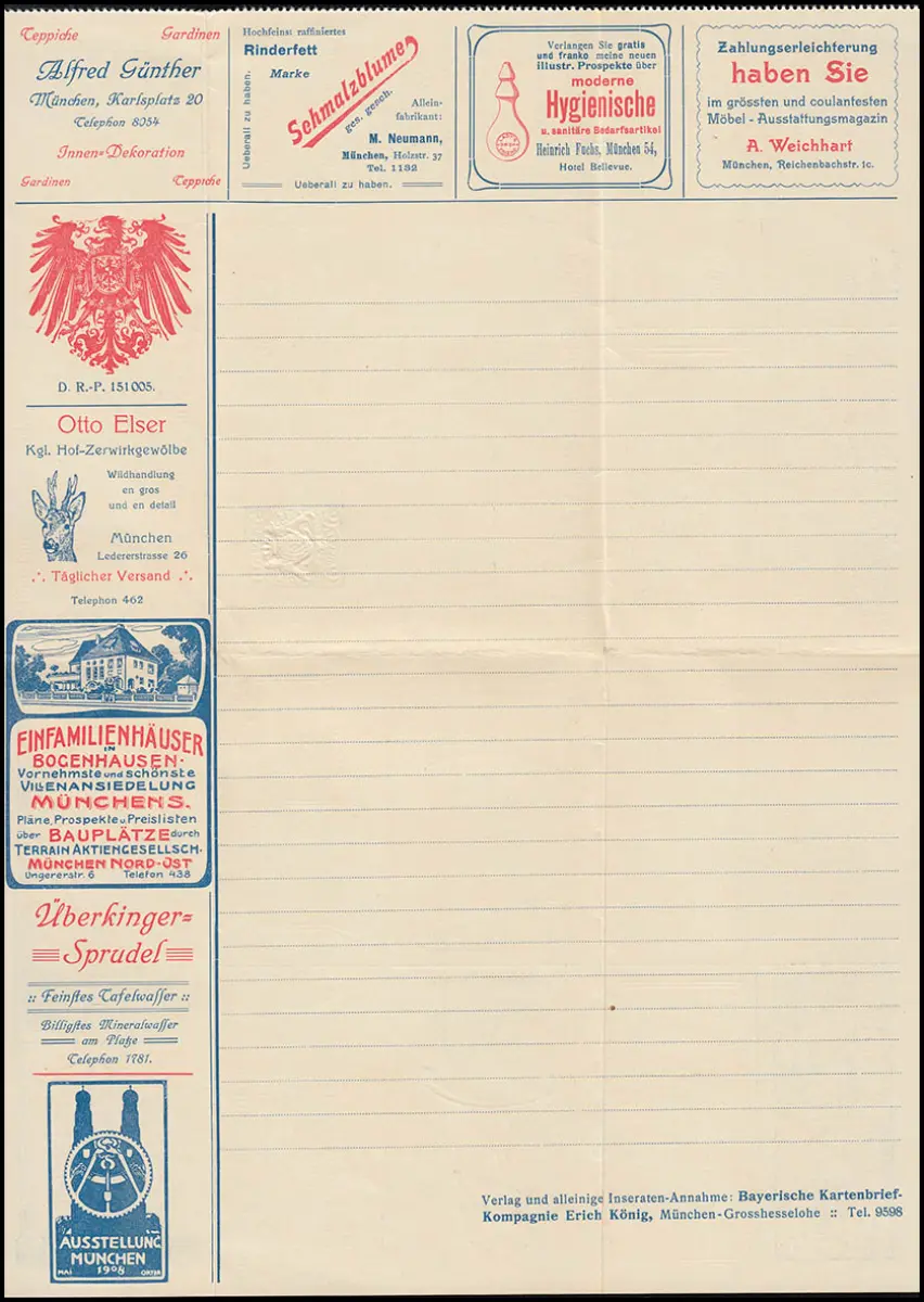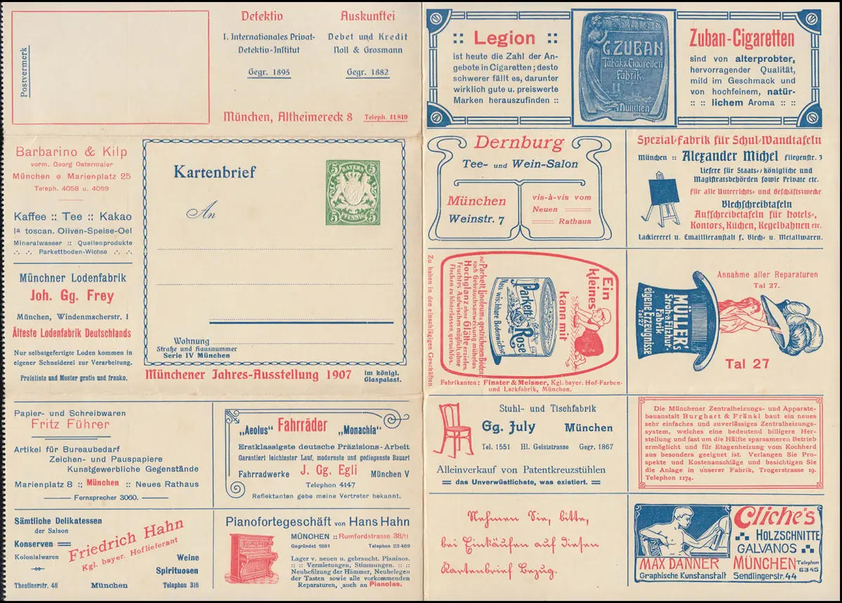 Privat-Ganzsache zur Münchener Jahres-Ausstellung 1907 im königlichen Glaspalast mit diversen Firmen-Anzeigen, ungebraucht. Die Abbildungen zeigen die Karte im aufgeklappten Zustand, original-Faltung für den postalischen Gebrauch. Selten angeboten!