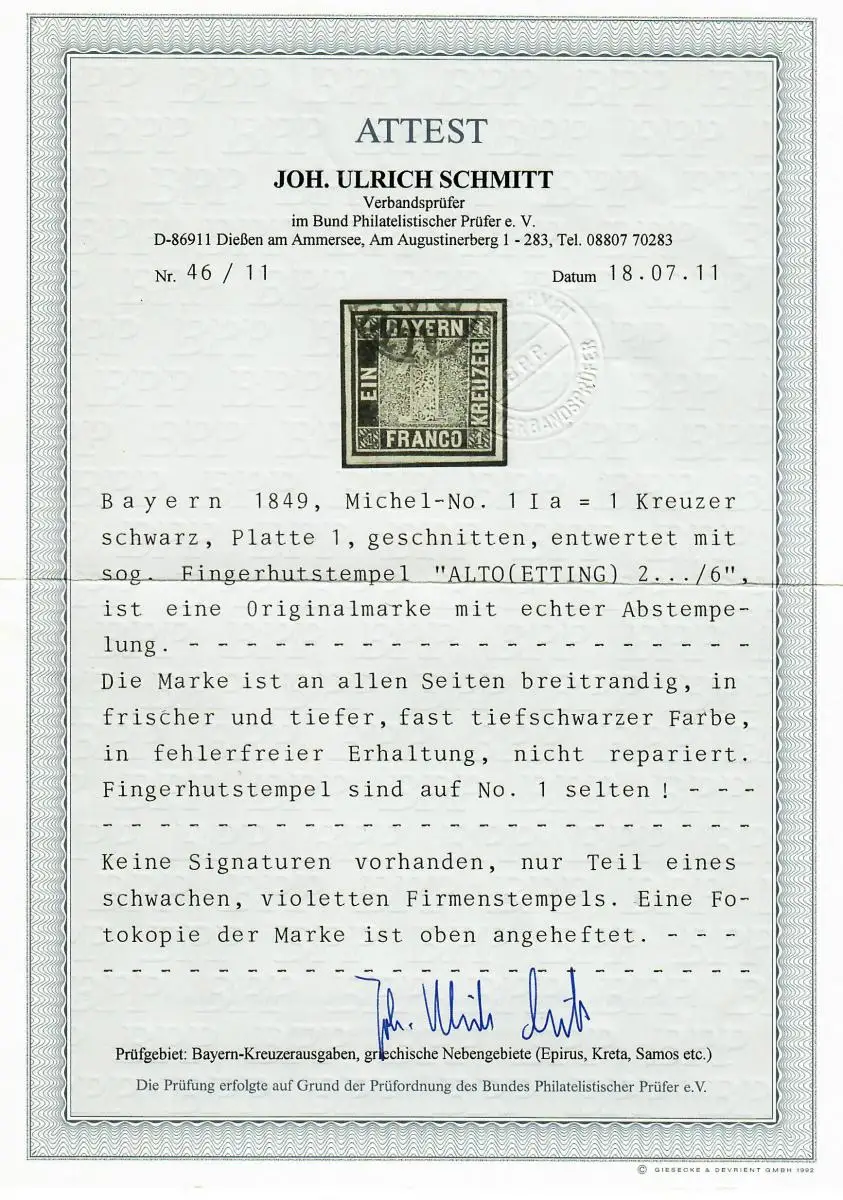 Bavière: Min. 1 Ia, cacheté Alto(etting), cachet de chapeau, BPP Attest