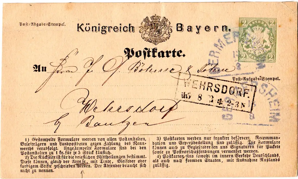 Bayern P 1 IIe, 2 Kr. Ganzsache m. Setzfehler "Adre se" u. HKS Germersheim