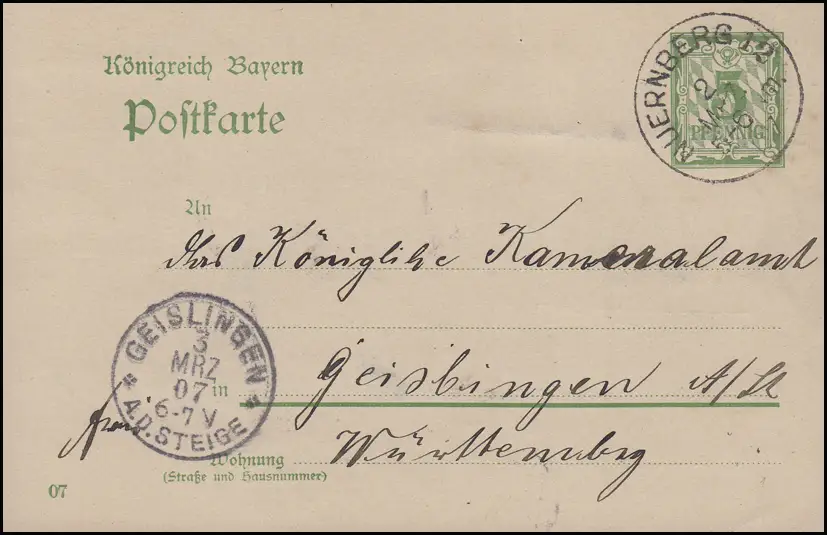 Bayern P 66/05 Paragraphe 5 Pf vert DV 07: NÜRNBERG 2.3.07 par Geislingen 3.3.07