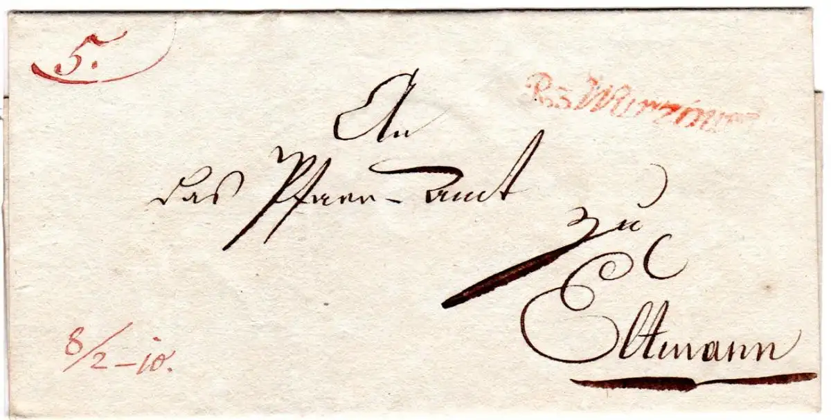 Bayern, roter Schreibschrift-L1 R.3. Würzburg auf Brief n. Eltmann