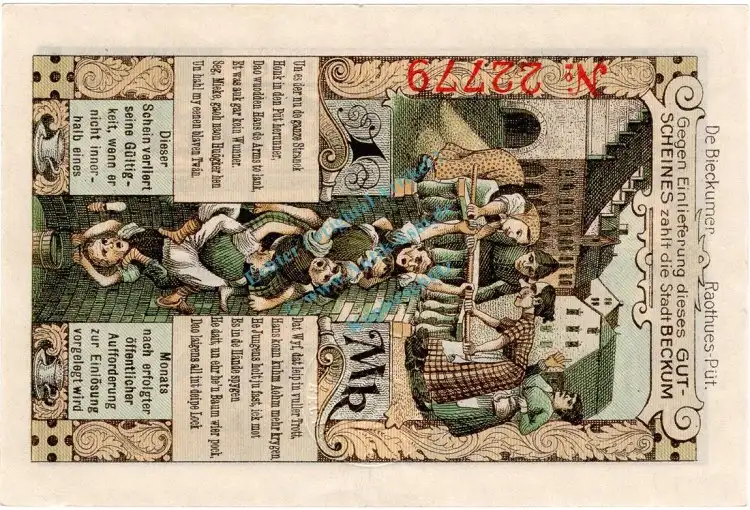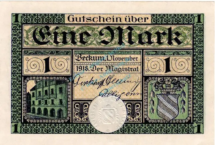 Beckum , Banknote 1 Mark Schein unc-kfr. Geiger 035.01.c-d , Westfalen 1918 Grossnotgeld