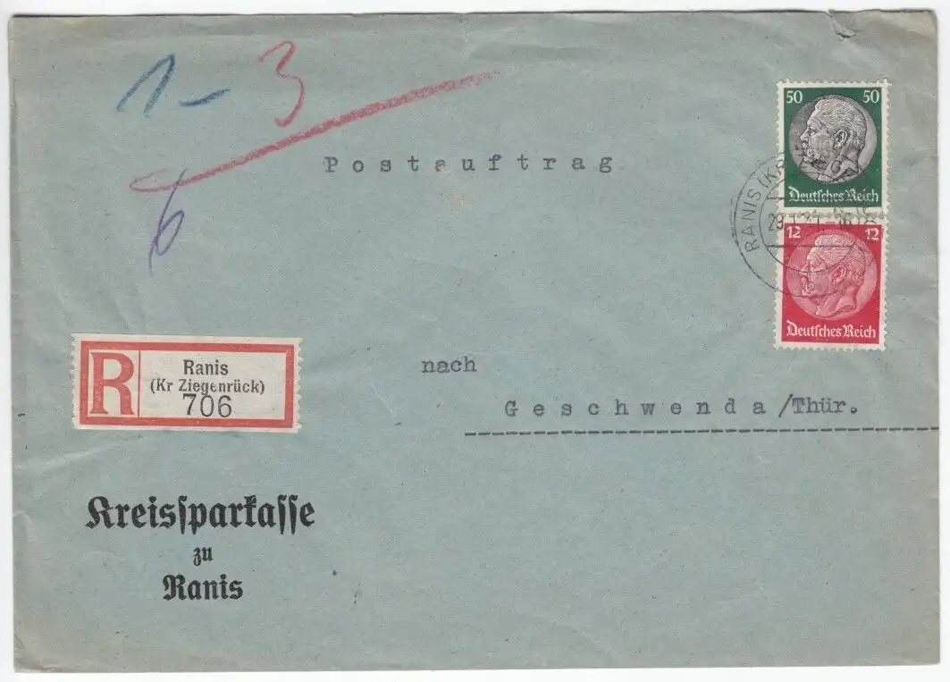 Bedarfsbeleg, R-Brief, DR 525 MiF 518, Postauftrag Absender: Kreissparkasse zu Ranis Empfänger: Postauftrag Geschwenda Nebenstempel: keine Anmerkungen: keine
