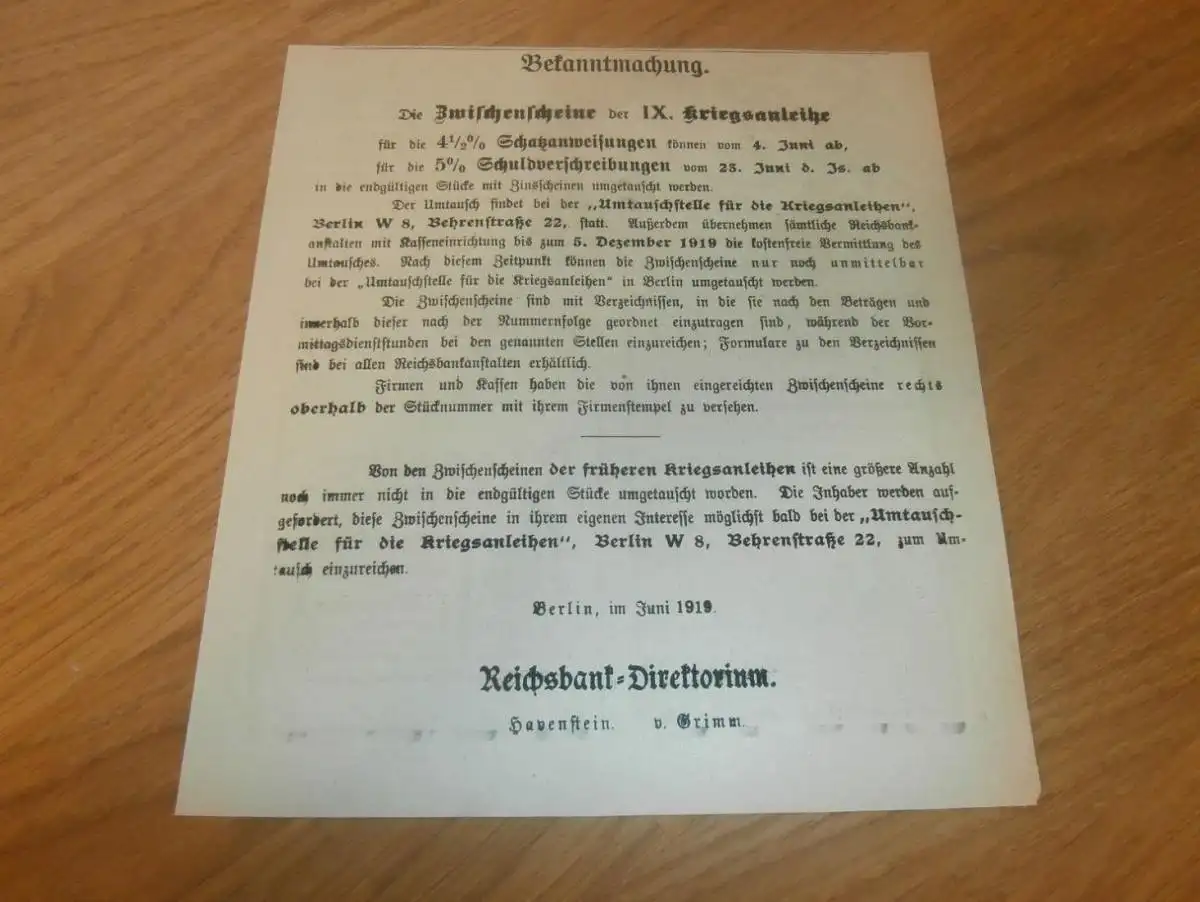 Bekanntmachung zur Kriegsanleihe 1919 , Anleihe , Reichsbank , Schuldverschreibung / Schatzanweisung !!