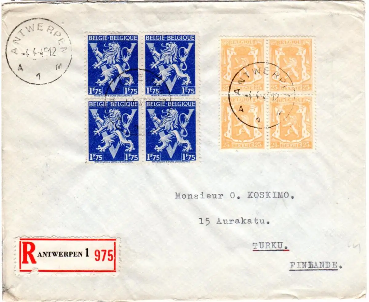 Belgien 1946, 4er-Blöcke 25 C.+1,75 F. auf Reko Brief v. Antwerpen n. Finnland