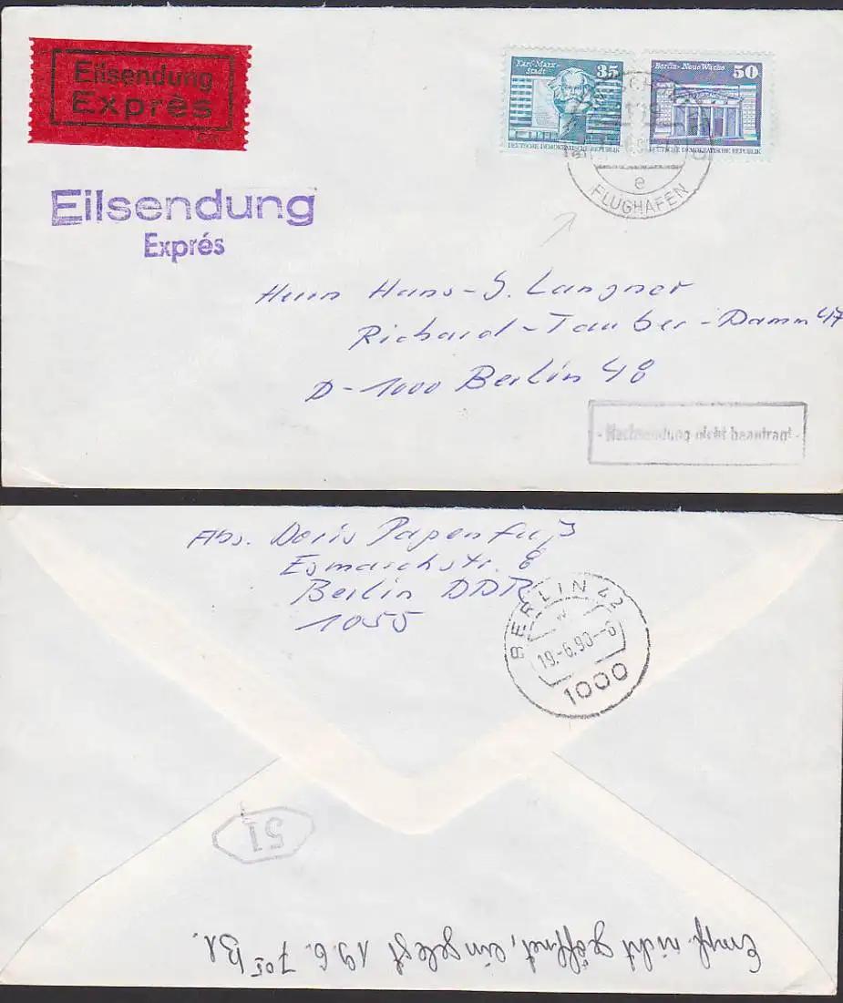 Berlin Flughafen Eilbrief nach Berlin West mit R1 Nachsendung nicht beantragt, rs. Empfänger nicht geöffnet, eingelegt