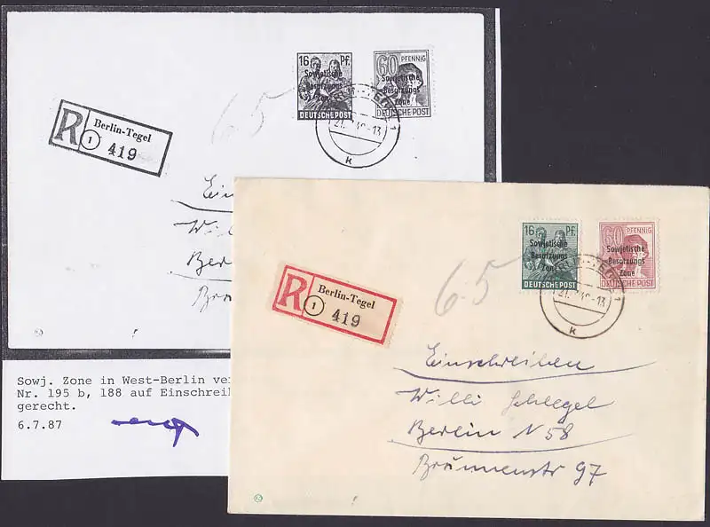 Berlin-Tegel SBZ-Marken in Berlin(West) verwendet R-Orts-Brief , Potogenau, Prferprotokoll