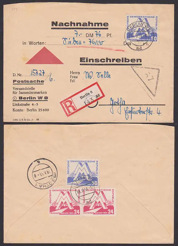 Berlin W8 Nachnahme mit Messe-Marken 1951 (283/84) je zweimal