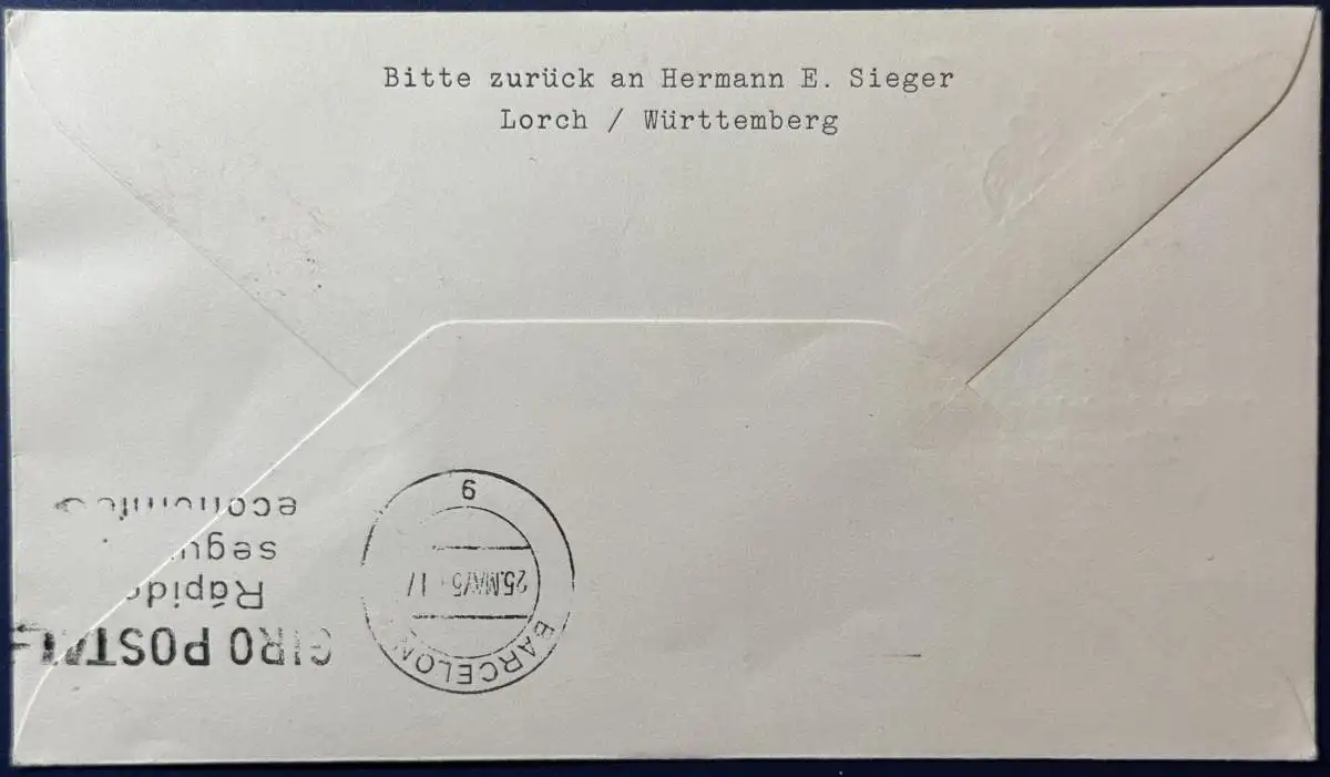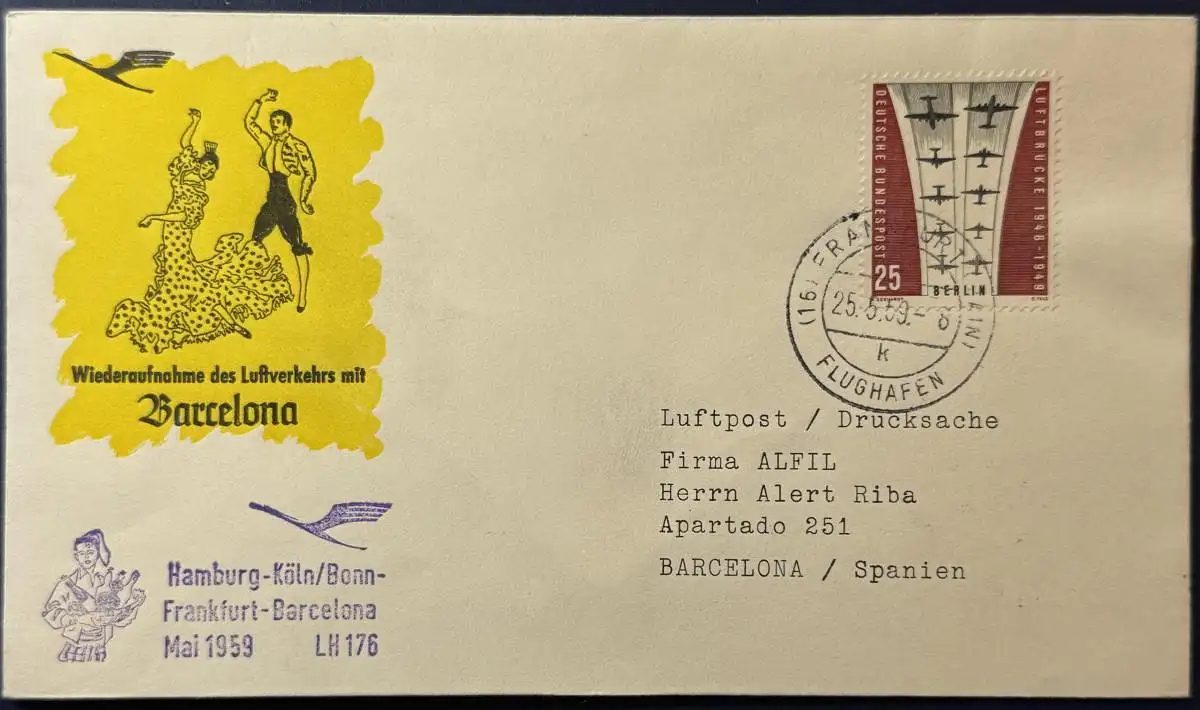 Luftpostbrief, Bund, anläßlich der Wiederaufnahme des Luftverkehrs mit Barcelona, frankiert mit Berlin Mi.Nr. 188, gelaufen von Frankfurt nach Barcelona und zurück mit Poststempel vom 25.05.1959.