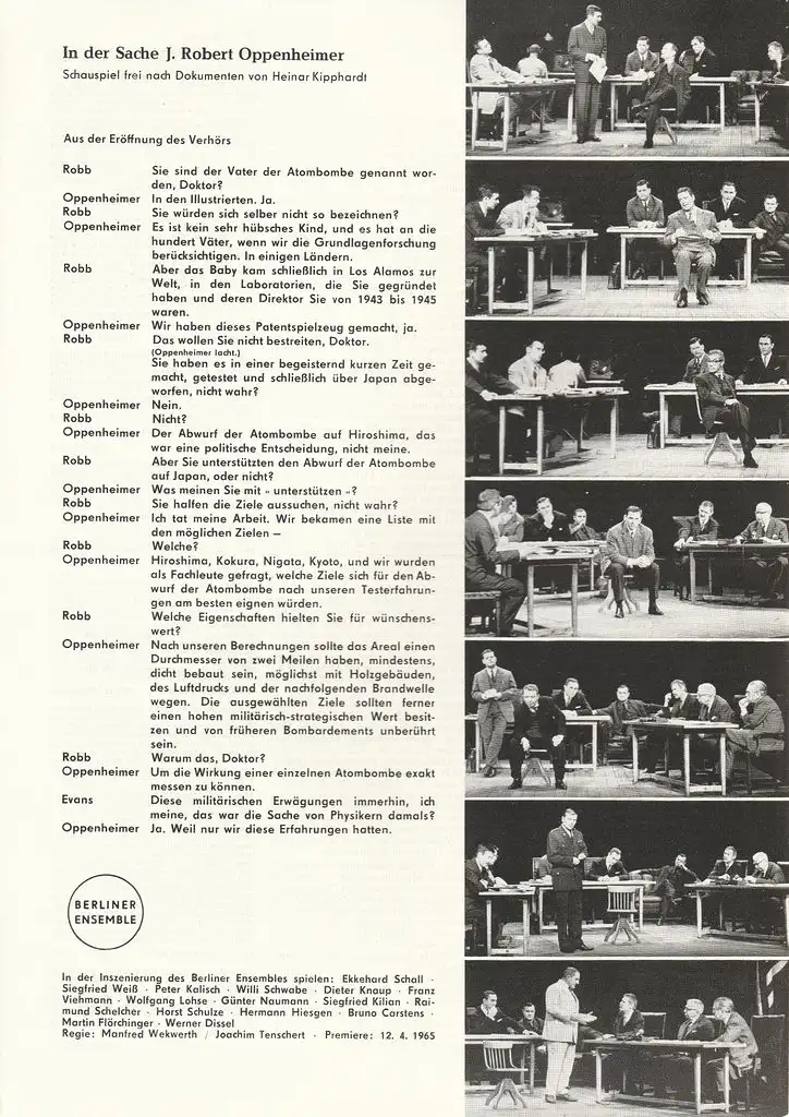 Berliner Ensemble: Werbeflyer Heinar Kipphardt IN DER SACHE J. ROBERT OPPENHEIMER Berliner Ensemble 1965.