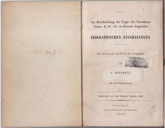 Bertheau, E(rnst): Die der Beschreibung der Lage des Paradieses Genes. 2, 10 - 14. zu Grunde liegenden geographischen Anschauungen. Ein Beitrag zur Geschichte der Geographie. - Abgedruckt aus den Göttinger Studien 1847.