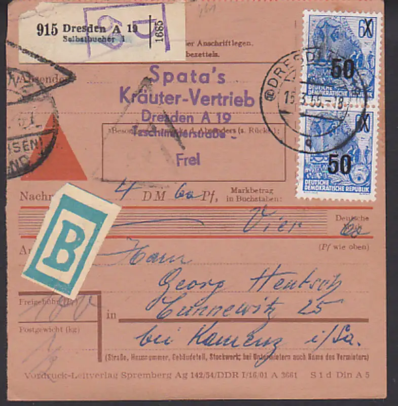 Beutelpaket mit Nachnahme aus Dresden Selbstbucher (461), selten MeF 15.3.55 nach Cunnewitz