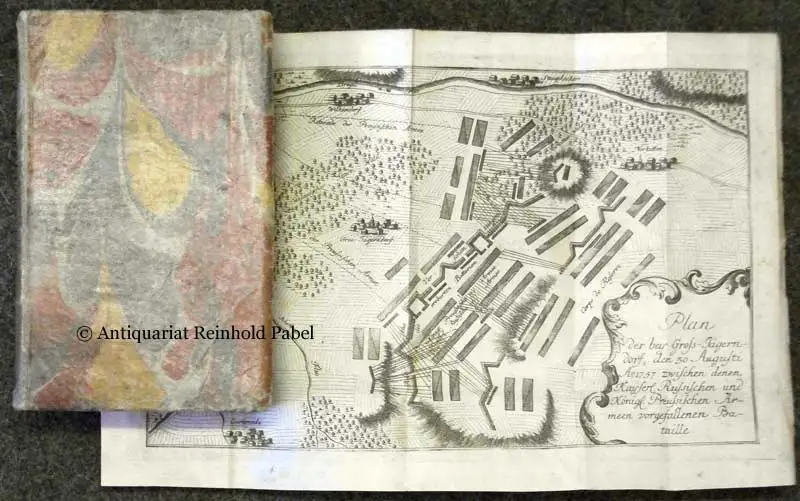 Einband berieben u. bestoßen. - Zur Geschichte des Siebenjährigen Krieges. - Enthält u.a.: Von dem Hofe zu Petersburg u. der Rußisch Kayserl. Armee; von der Königl. Preußischen den Rußisch-Kayserlichen Truppen entgegen gesetzten Armee (Schlacht bei Groß-Jägerndorf, mit Liste der Preußischen Verluste); von den Königl. Preußischen Armee in Schlesien. Von den Unternehmungen der Königl. Schwedischen Truppen in Deutschland u. den Königl. Preußischen Gegen-Anstalten. Von dem Kayserl. Königl. Hofe u. der Oesterreichischen Armee; von dem Hofe zu Berlin u. den Preußischen Armeen, etc. etc. Der Plan zeigt die "Schlacht bey Groß-Jägerndorf in Preussen"