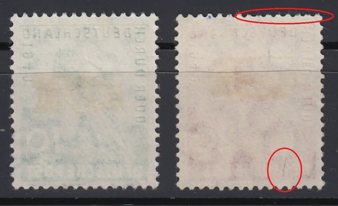 Bei gestempelten Marken kann es auf der Rückseite Beschriftungen mit Bleistift, Falz oder Falzreste geben, dies wird nicht separat erwähnt.