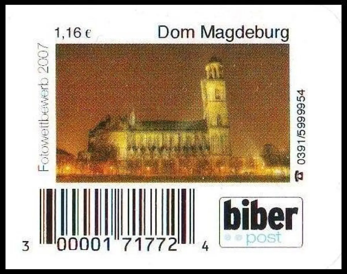 • MichSeite Biberpost: MiNr. 37, 01.09.2007, "Fotowettbewerb 2007: Magdeburg, Dom", Wert zu 1,16 EUR, Typ V, postfrisch Beschreibung \nAusgabeland: Bundesrepublik Deutschland \nPostdienstleister: Biberpost, Magdeburg \nAusgabeanlass: Briefmarkenausgabe "Fotowettbewerb 2007: Magdeburg, Dom" Katalognummer: MiNr. 37 Ausgabedatum: 01.09.2007 Nominale: Wert zu 1,16 EUR \nTyp: V,  Abstand zwischen Strichcode und Logo 3,2 mm \nErhaltung: selbstklebend, zähnungsartig gestanzt, postfrisch \nHinweis: -