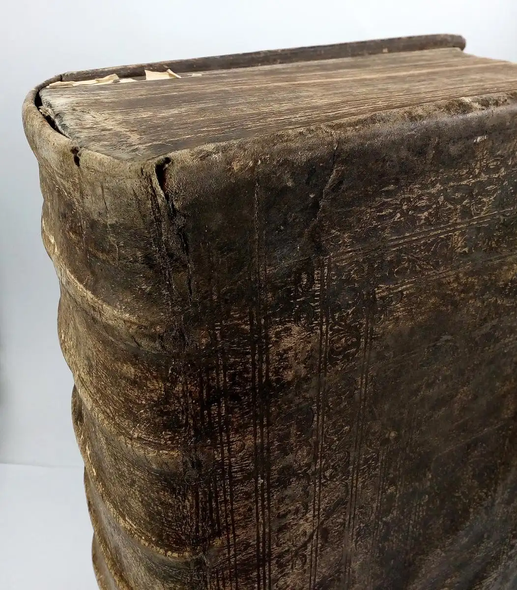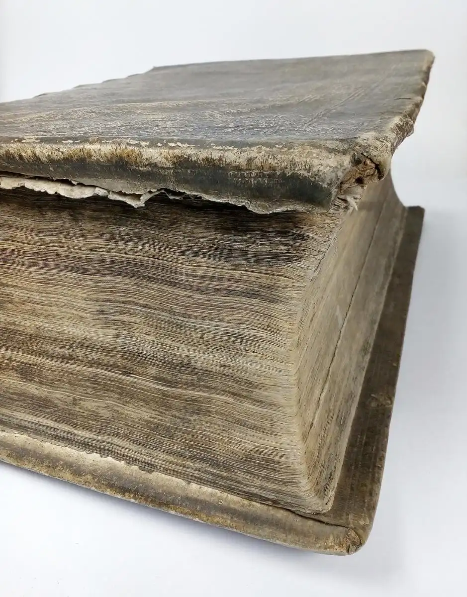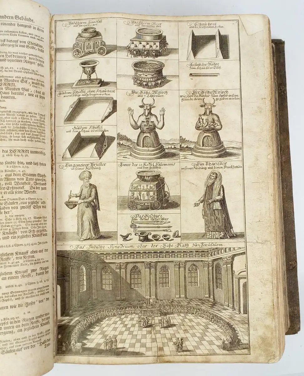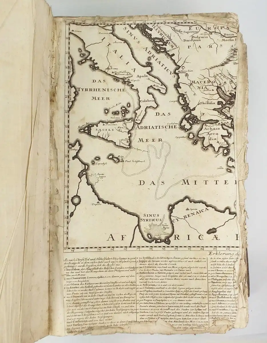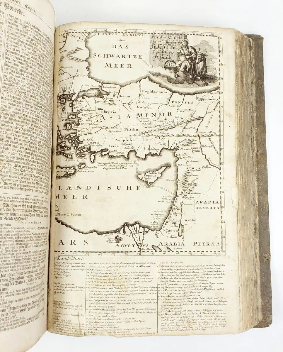 Bemerkungen: Zustand: Einband berieben, Ecken und Kanten bestoßen, Schnitt angeschmutzt, Titelblatt repariert, Abbildungsseiten 358/359 (AT) und 254/255 (NT) repariert, 1. Karte beschädigt, 2. Karte nur halb vorhanden, die ersten Seiten mit Randläsuren, Bindung gut