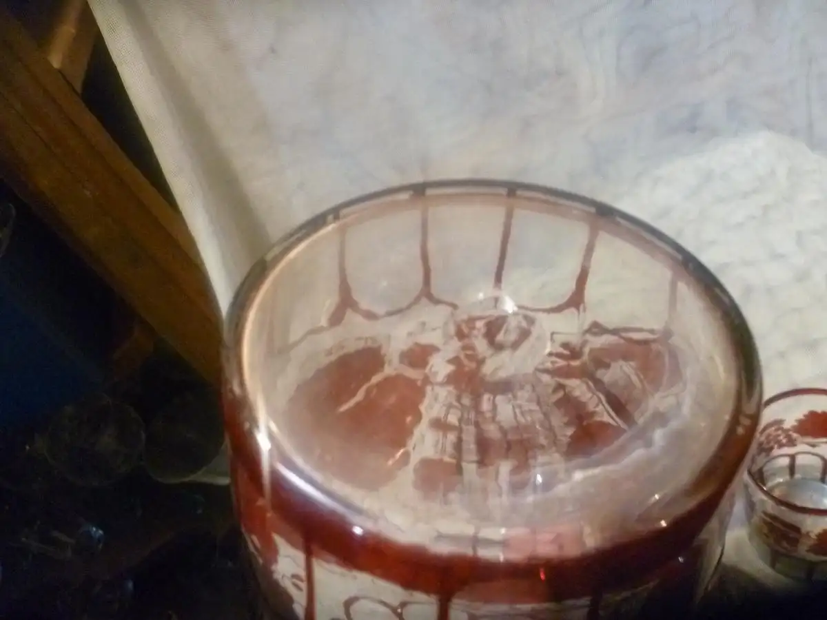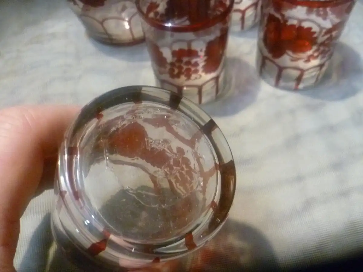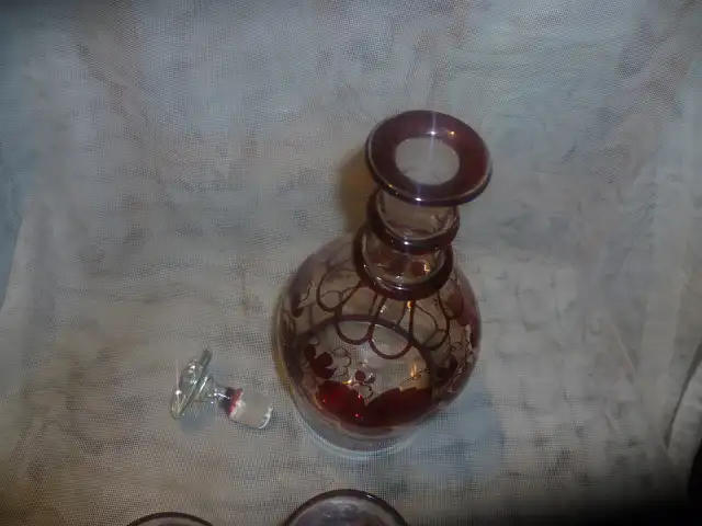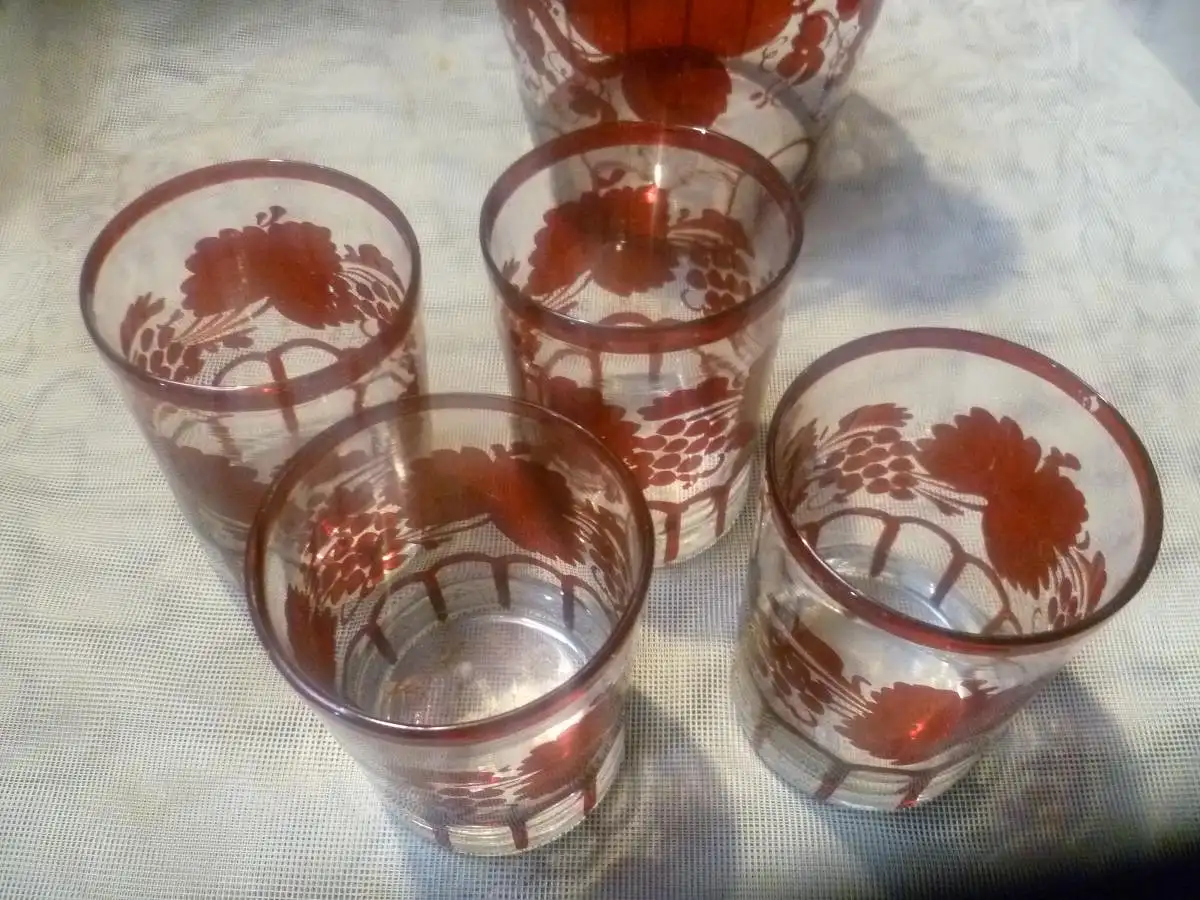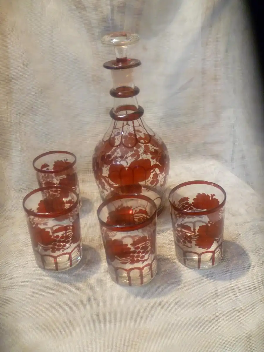 Biedermeier Karaffe mit Stöpsel . und 4 Gläser um 1860 Partiell rot überfangen. Florales Weinreben Dekor Abriss