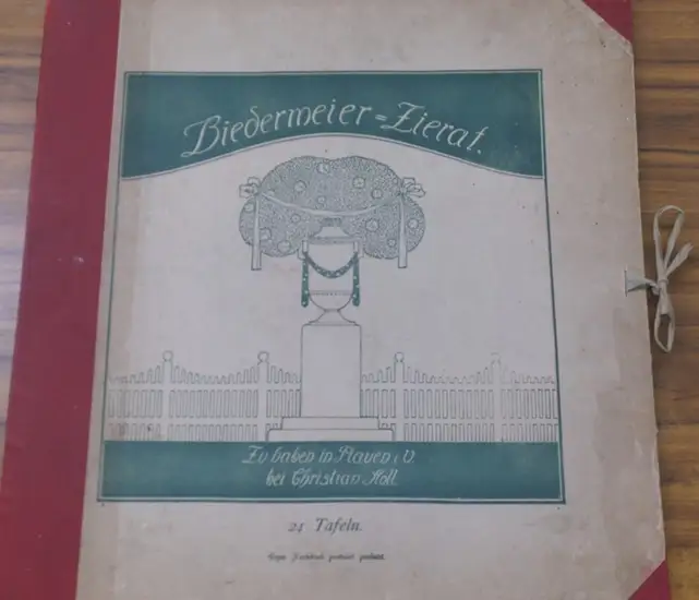 Freie Beschreibung: Folio ( 40 x 39,5 cm). Rote Originalhalbleinenmappe mit illustriertem Deckelbild und Stoffkordel zum Öffnen und Schließen. Der Einband berieben, nachgedunkelt und auch etwas fleckig, die Mappenrückseite mit einer abgeschabten Stelle (ca. 2,5 x 2,5 cm). Lose innenliegend die kompletten 24 Tafeln mit einfarbigen, unbetitelten Abbildungem von biedermeierlichen Motiven ( Dekorationen, Ornamenten, Pflanzenarrangements, Menschen, Tiere, Kunsthandwerk, Silhouetten, Portraits nach Scherenschnittart u.v.a.). Die Tafeln im Randbereich teilweise leicht fleckig und mit kleinen Knicken, die Tafel 1 am oberen Rand mit einer gebräunten Stelle (ca. 6 x 2 cm). Einige der unbedruckten Tafelrückseiten ebenfalls fleckig. Insgesamt jedoch gutes und vollständiges Exemplar
