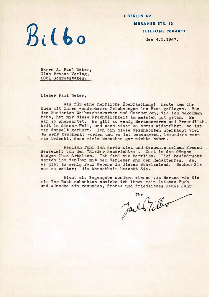 BEIGABE: Maschinenschriftlicher Brief mit dem Briefkopf Bilbos u. eigenhändiger Unterschrift an den Lithographen, Zeichner u. Maler A. PAUL WEBER (1893-1980) mit Dank für ein zu Weihnachten 1966 zugeschicktes Buch "mit Ihren wunderbaren Zeichnungen... es gibt zu wenige Paul Webers in diesem Scheissland. Machen Sie nur so weiter; die Menschheit braucht Sie". - Das Buch gibt einen ausgedehnten Überblick über Leben und Werk des Autors, Malers, Galeristen, Antifaschisten, Abenteurers, Seemanns und Gastwirts Jack Bilbo (d.i. Hugo Cyrill Kulp Baruch, 1907-1967). Bekannt wurde er bereits 1932 mit seinem Roman "Ein Mensch wird Verbrecher", in dem er seine angebliche Tätigkeit als Al Capones Leibwächter schildert. - Einband berieben u. leicht bestoßen, erste Blätter an den ob. Ecken geknickt, 1 Bl. gestaucht, 1 Bl. mit Randeinriß, 1 Bl. mit kleinem beigefügten Eckausriss