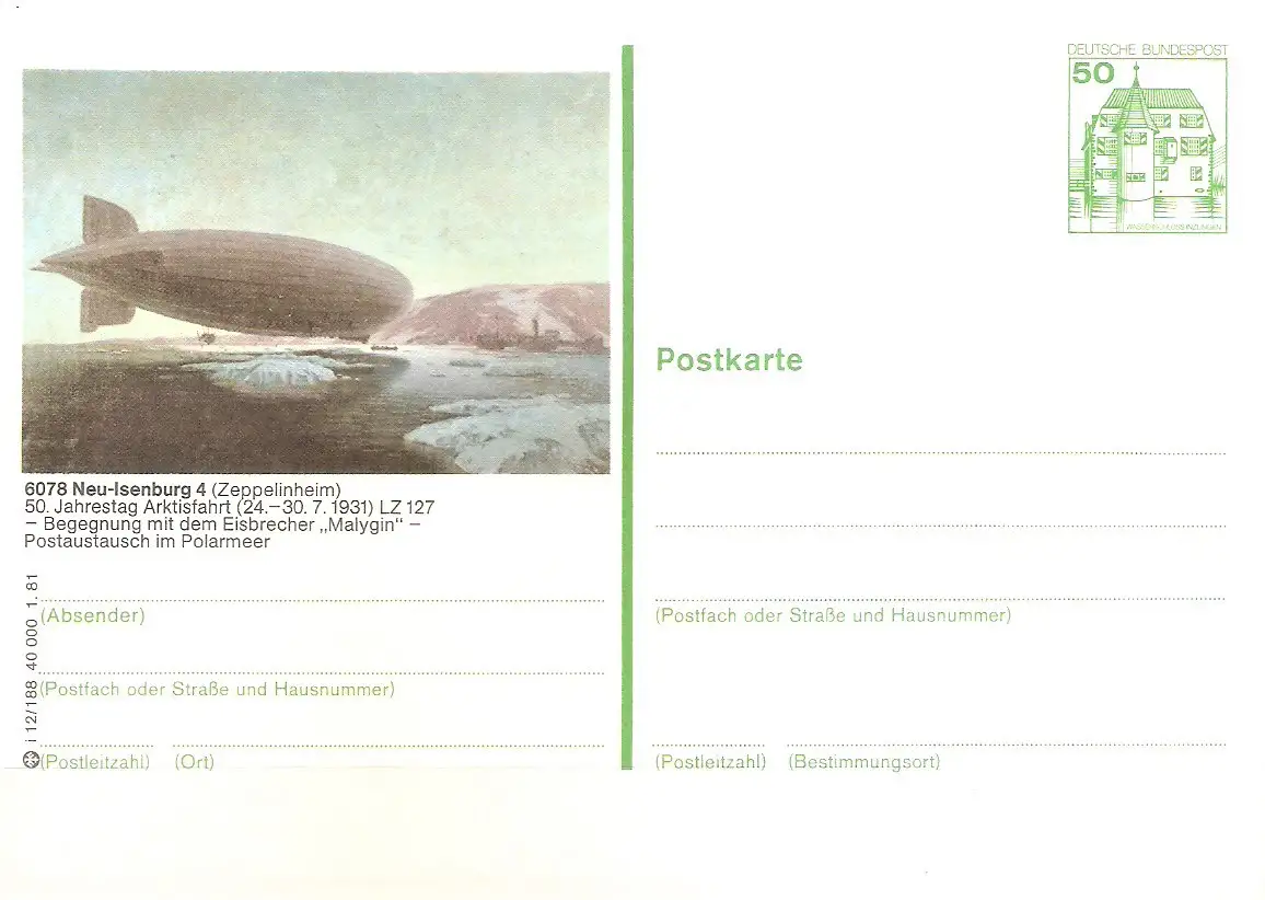 Bildpostkarte 6078 Neu-Isenburg 4 (Zeppelinheim) von 1981 / Zeppelin LZ 127 & Eisbrecher "Malygin" (bpk12)