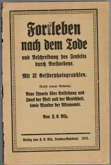 Bilz, F. E: Fortleben nach dem Tode und Beschreibung des Jenseits durch Verstorbene. Mit 32 Geisterphotographien. Nebst einem Anhang: Neue Theorie über Entstehung und Zweck der Welt und der Menschheit, sowie Wunder der Astronomie Dresden-Radebeul, F. E.