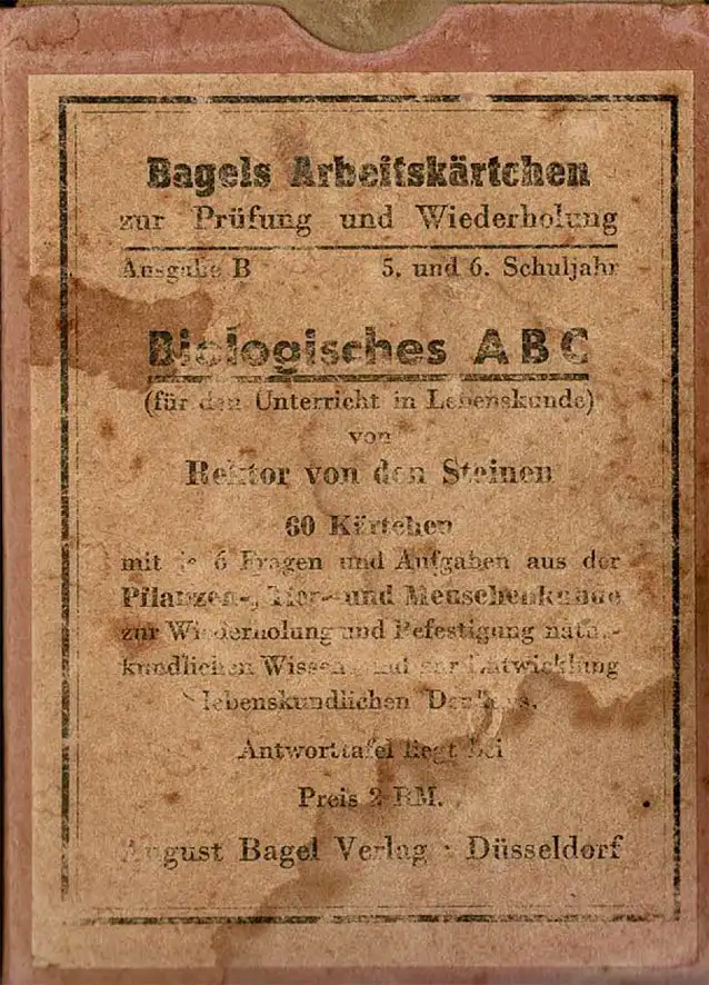 Titel: Biologisches ABC (für den Unterricht in Lebenskunde). Bagels Arbeitskärtchen zur Prüfung und Wiederholung, Ausgabe B - 5. und 6. Schuljahr. 60 Kärtchen mit je 6 Fragen und Antworten aus der Pflanzen-, Tier- u. Menschenkunde zur Wiederholung u. Befestigung d. naturkundl. Wissens u. zur Entwicklg lebenskundlichen Denkens