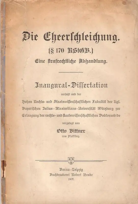 Bittner, Otto: Die Eheerschleichung <§ 170 R.St.G.B.>. Eine strafrechtl. Abhandlung. (Dissertation).