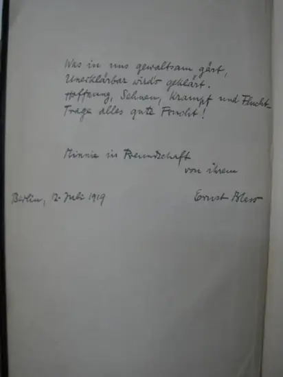 Titel: Eigenhändiges, 4-zeiliges, unveröffentlichtes Gedicht: Was in uns gewaltsam gärt, / unerklärbar wird's geklärt. / Hoffnung, Sehnen, Krampf und Flucht- / Trage alles gute Frucht! / Minnie in Freundschaft / von ihrem / Ernst Blass. Berlin, 12. Juli 1919