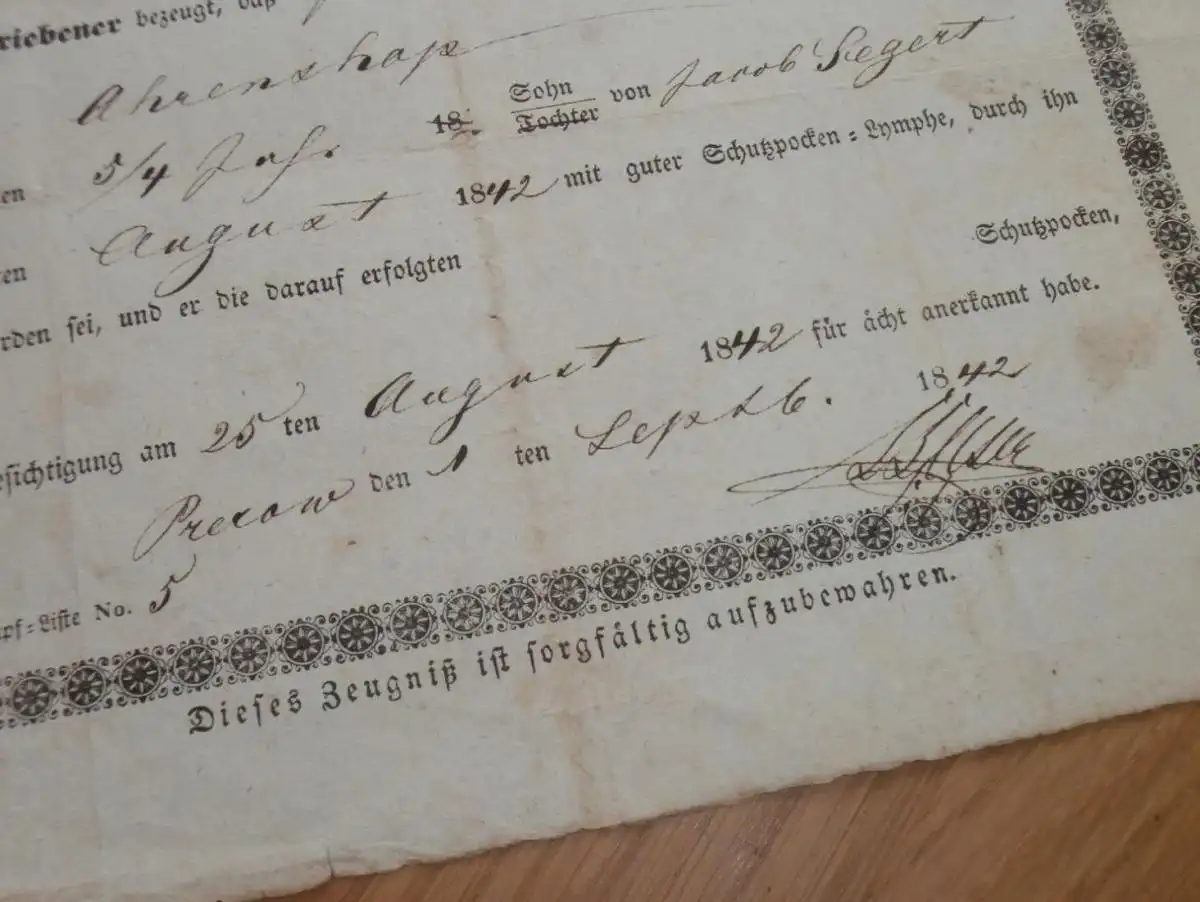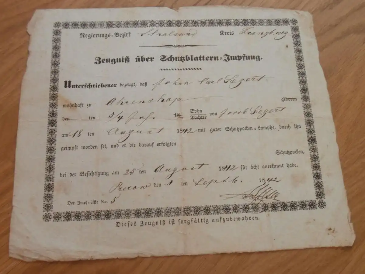 Blattern-Impfung , Prerow , 1842, J. Segert in Ahrenshoop , Franzburg , Stralsund , Mecklenburg , Medizin , Arzt !!