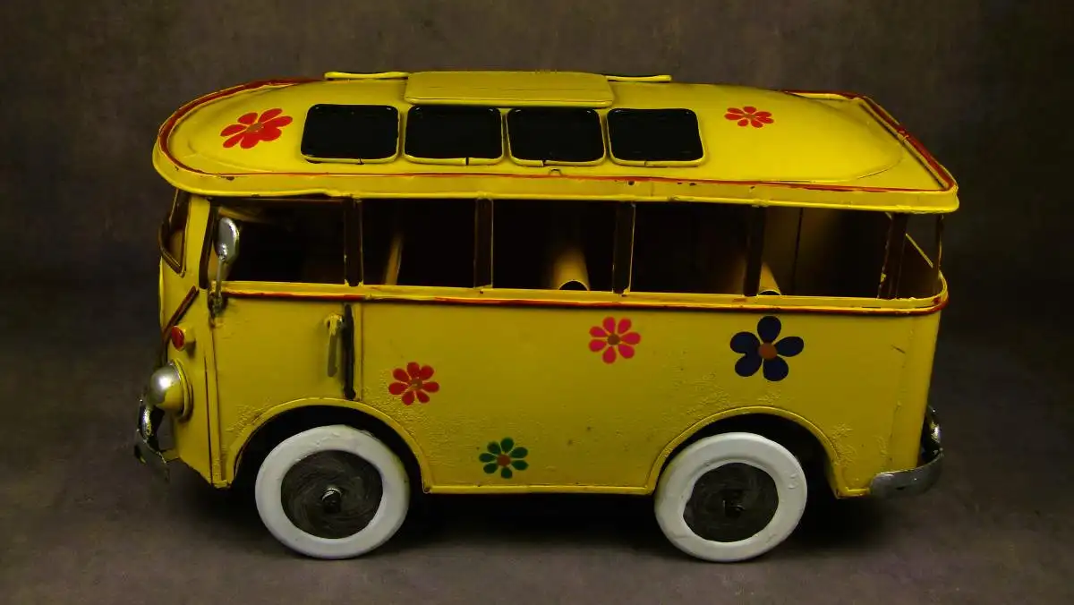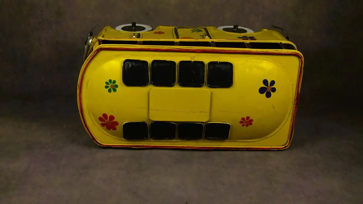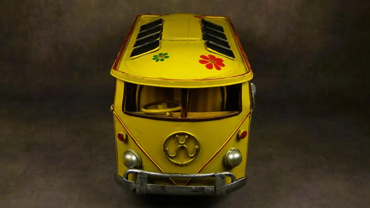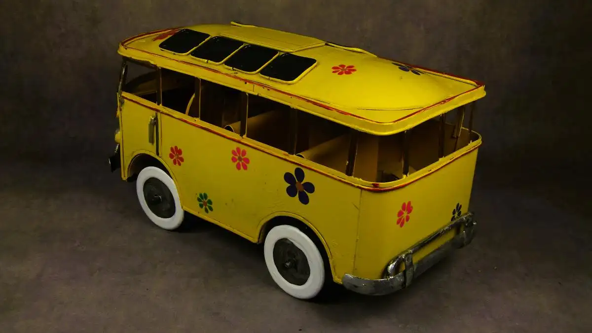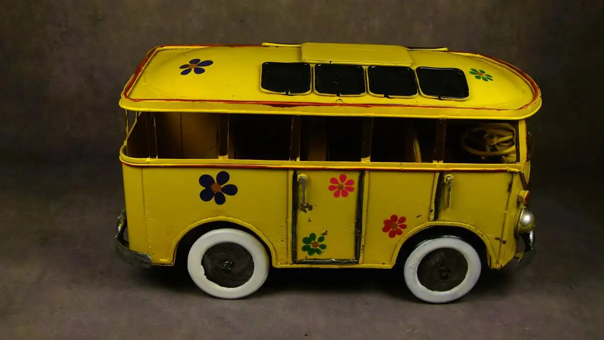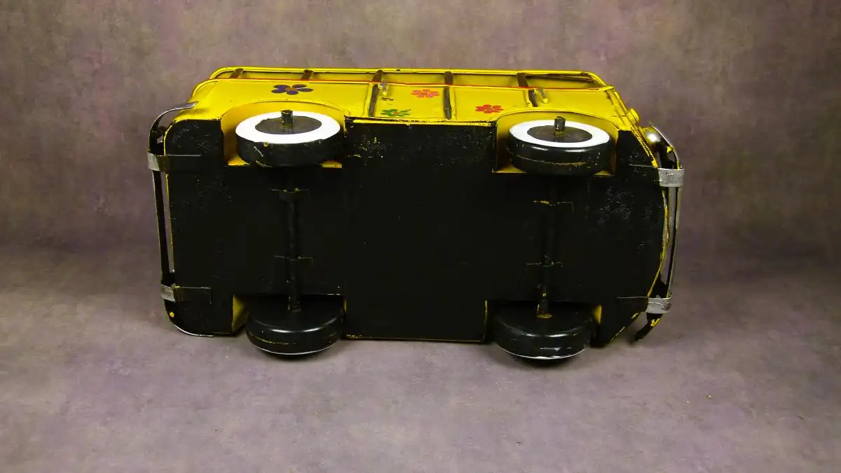 Vintage Blechspielzeug-Wohnmobil im Stil des ikonischen VW-Busses aus der Mitte des 20. Jahrhunderts, komplett aus Metall, inklusive Reifen und Chassis. Mit buntem Retro-Design in Rot, Gelb und Grün sowie Blumenmustern an Seiten und Dach. Sehr guter Zustand ohne Dellen oder Rost. Ideal für Sammler, Spielzeugliebhaber oder als nostalgischer Dekor-Akzent im Hippie-Stil.