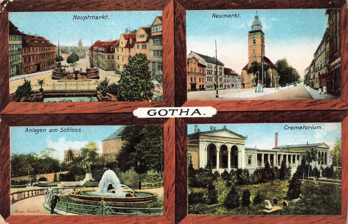 Blick auf Markt mit Krematorium, Schlossanlagen Gotha Thüringen Postkarte AK