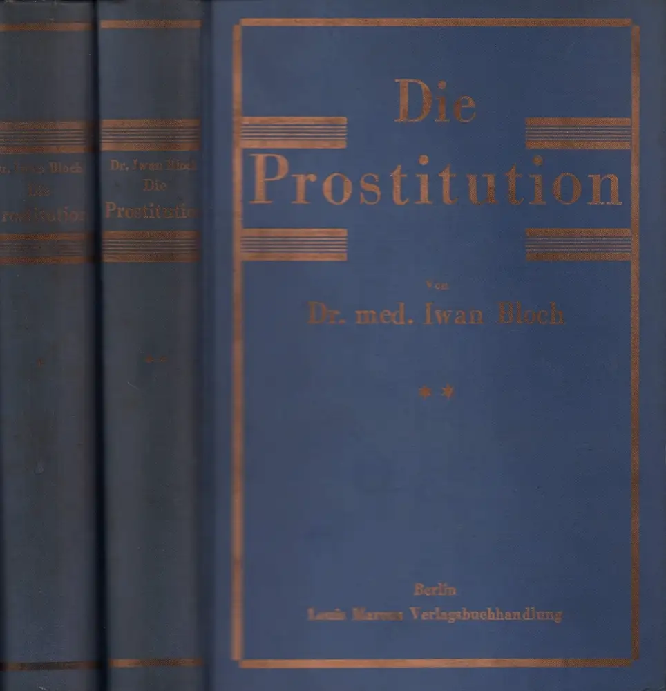 Bd. 1 (1.-10. Tsd.): Der Ursprung der Prostitution (Von den Anfängen bis zum Mittelalter); Bd. 2,1 unter Mitarbeit von Georg Loewenstein (1.-4. Aufl.): (Vom ersten Auftreten der Syphilis bis zu Versuchen zur staatlichen u. kommunalen Regelung der Prostitution im 18 . Jahrhundert u. im Zeitalter der sogenannten Reaktion). - Jeder Band mit Namen-, Länder-, Orts- u. Sachregister. - Iwan Bloch (1872-1922), Mediziner, Dermatovenerologe u. Sexualforscher, war einer der Begründer der Sexualwissenschaft. Georg Wolfgang Loewenstein (1890-1986), sozialistischer Arzt, Sexualwissenschaftler u. Sozialhygieniker, emigrierte 1938 über England in die USA. - Einbände tlw. nachgedunkelt und matt fleckig, Schnitt mäßig stockfleckig