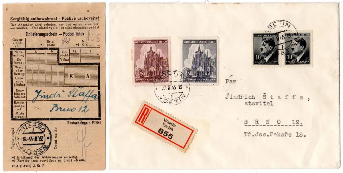 Später Einschreiben Brief m. 2-sprachigem Stempel u. R-Zettel v. Wsetin/Vsetin und zugehörigem Einlieferungsschein. Brünn Ank. Stpl. rückseitig.