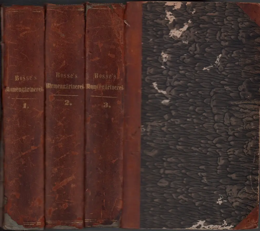 Grundlegendes, zuerst 1829 erschienenes Werk von dem Großherzoglich Oldenburgischen Hofgärtner Julius Friedrich Wilhelm Bosse (1788-1864), den der sächsische Gartenschriftsteller Hermann Jäger zum "Nestor der deutschen Gartenschriftsteller" erklärte. - [1:]: Abies-Dyckia / [2.]: Ebalium-Oxyura / [3]: Pachypodium-Zygophyllum. - Jeder Band mit Register der deutschen Pflanzennamen. Hauptwerk mit Bd 1 - 3 komplett. (1849 u. 1854 folgten noch 2 Nachtragsbände "Neuere Zierpflanzen"). - Einbanddeckel beschabt Bezug, Rückenleder spröde u. mit kl. Fehlstellen, ein Vordergelenk leicht gelockert, Vorsätze leimschattig, Buchblöcke intakt und sauber