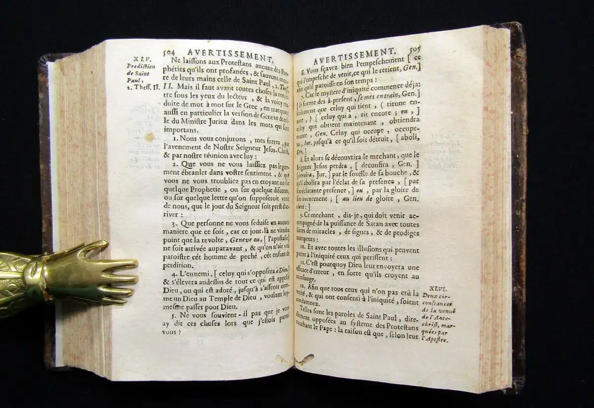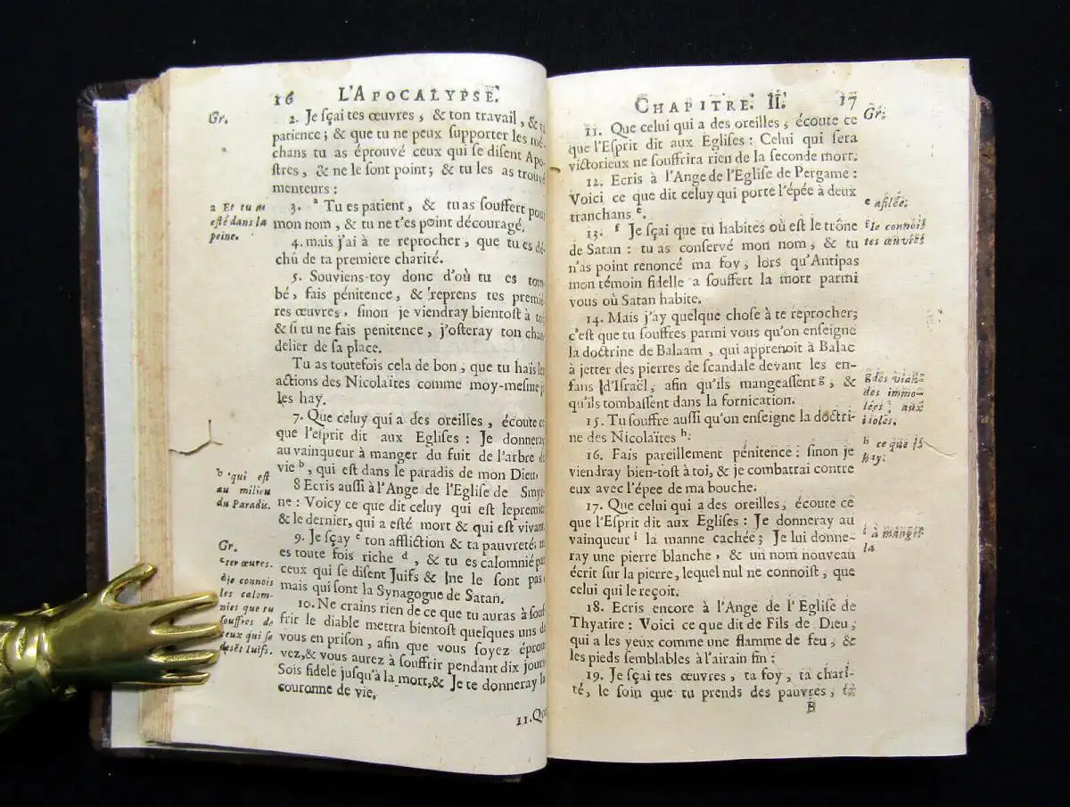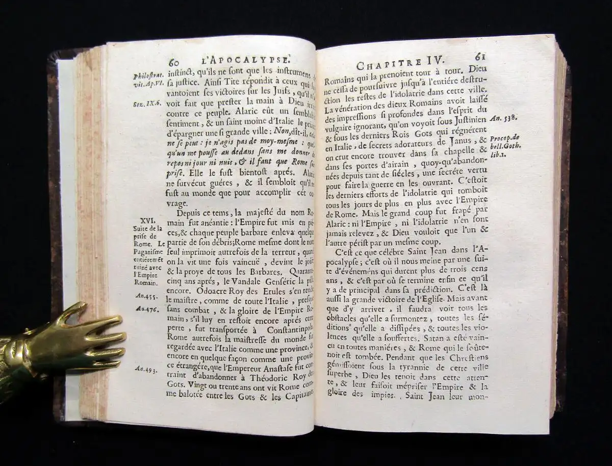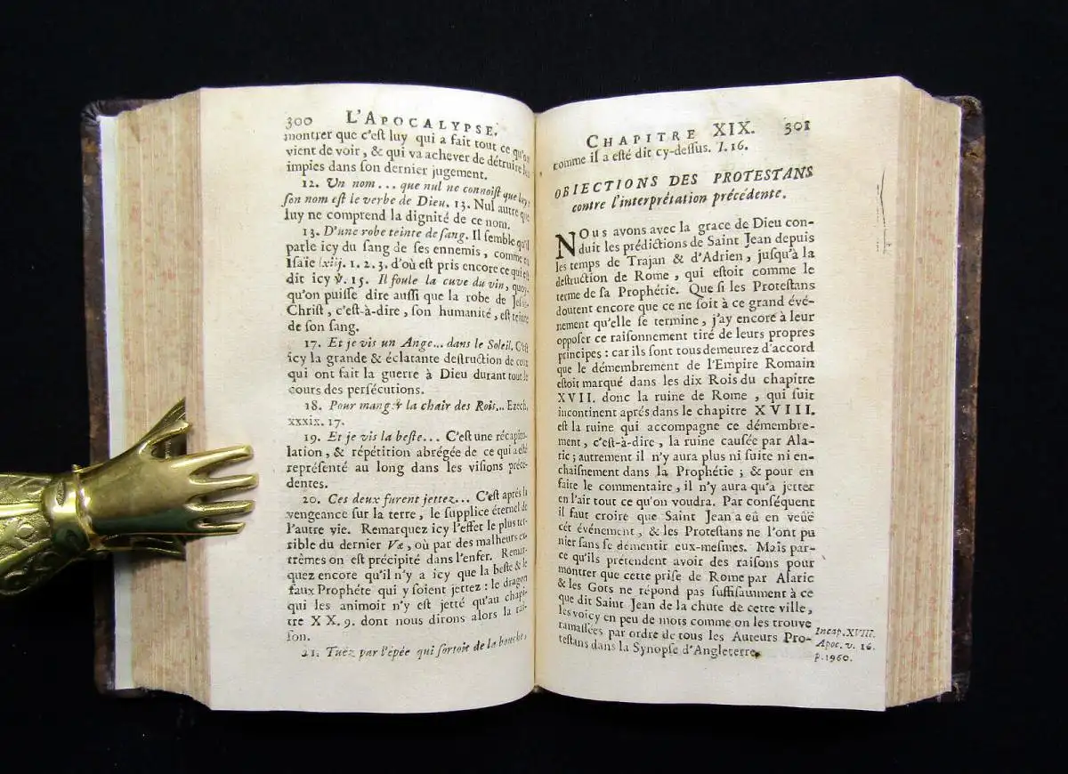 In einem langen Vorwort von 96 Seiten („Ein Vorwort, in dem die Möglichkeiten vorgeschlagen werden, aus der Lektüre der Apokalypse Nutzen zu ziehen, und die Prinzipien zur Entdeckung ihrer Bedeutung“) liefert Bossuet seine Interpretation der Apokalypse des Heiligen Johannes, die als eine angesehen wird Prophezeiung und bietet einige Klarstellungen. Insbesondere versuchte er zu beweisen, dass in diesem Text der Untergang Roms vorhergesagt wurde und dass andere vorhergesagte Ereignisse noch nicht eingetreten waren. Es folgt die Übersetzung von Bossuet, ein langes, ernstes und tiefgründiges Gedicht. Ausführliche Erläuterungen erleichtern das Verständnis des Textes. -