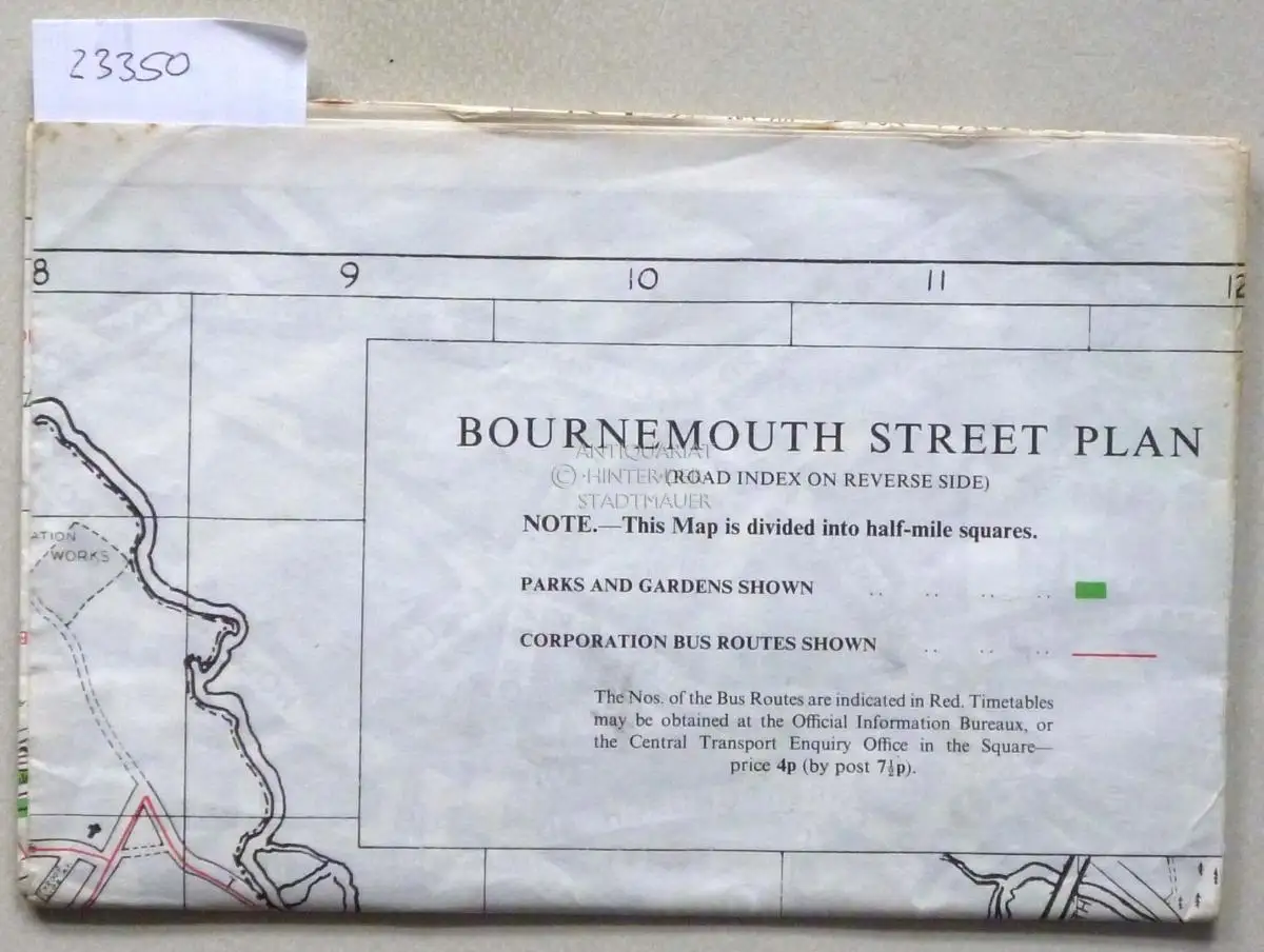 Stadtplan, Faltkarte. Dreifarbig gedruckt, mit Angabe von Parks und Busrouten. Rückseitig ein Detailplan der Promenade von Westbourne-Boscombe-Pokesdown-Southbourne-Tuckton. Karte an den Falzen leicht die berieben, die außenliegenden Abschnitt leicht gebräunt; gutes Exemplar