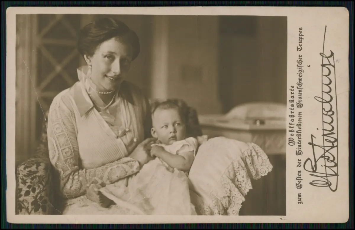 Braunschweig zeigt auf dieser Wohlfahrtskarte ein warmes Motiv einer Dame mit Kind, wie es laut überliefertem Begleittext mit Viktoria Luise von Preussen und einem ihrer Kinder in Verbindung gebracht wird.