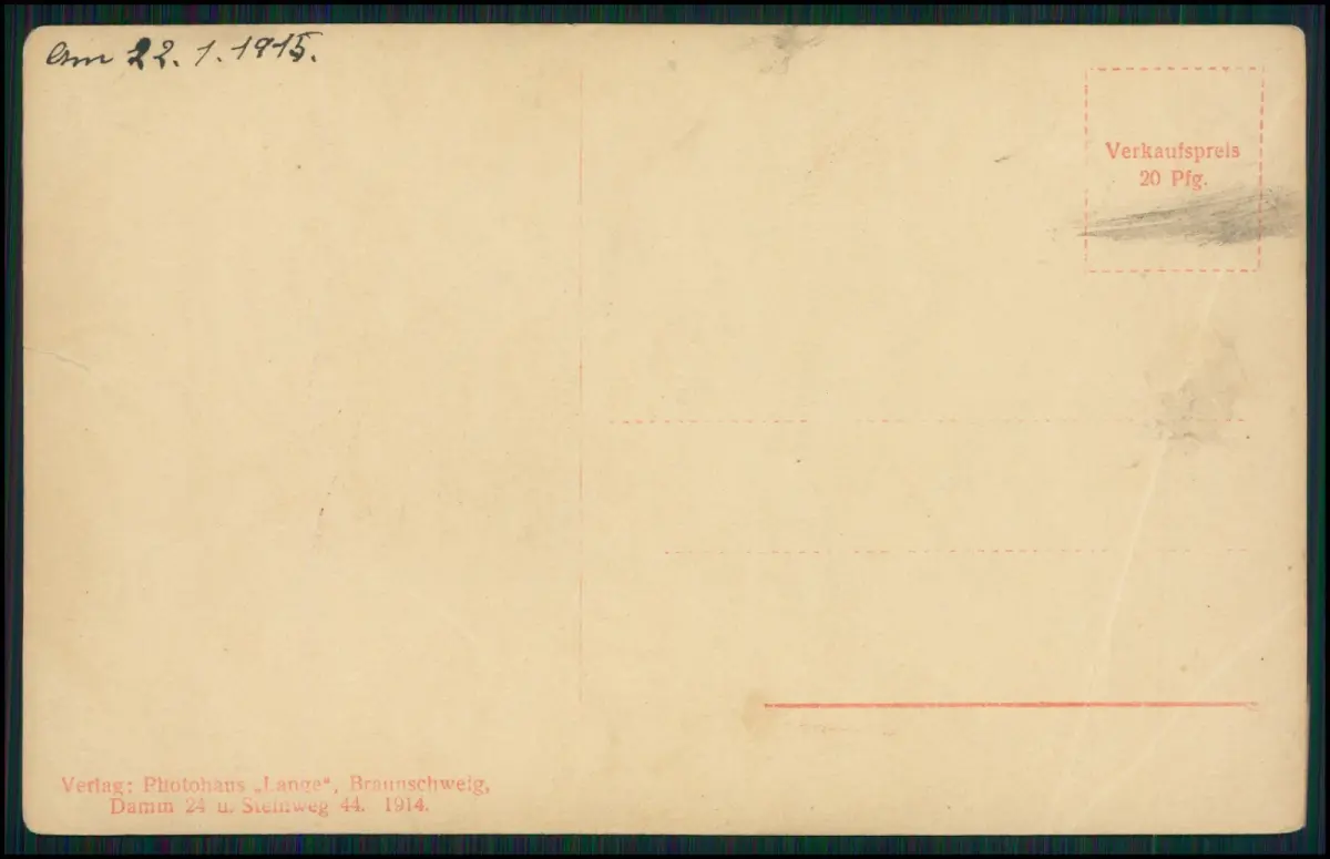 Der Verlag Photohaus Lange Braunschweig ist auf der Rückseite datiert und war im frühen zwanzigsten Jahrhundert für repräsentative Bildpostkarten bekannt. Am Rand befindet sich eine groß ausgeführte Signatur, typisch für Wohlfahrtsausgaben dieser Zeit.