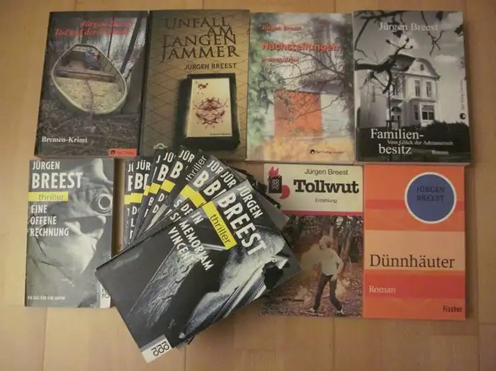 Breest, Jürgen (1936 - 2023): Großes Konvolut mit 16 Titeln. Es liegen vor: 1) Familienbesitz - Vom Glück der Adenauerzeit / 2. Nachstellungen - Bremen-Krimi / 3. Unfall am langen Jammer - Bremen-Roman / 4. Tod auf der Wümme - Bremen-Krimi / 5) In memoria