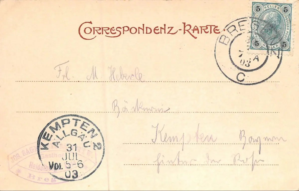 Rückseite: gelaufen 1903 von Bregenz nach Kempten (Allgäu)