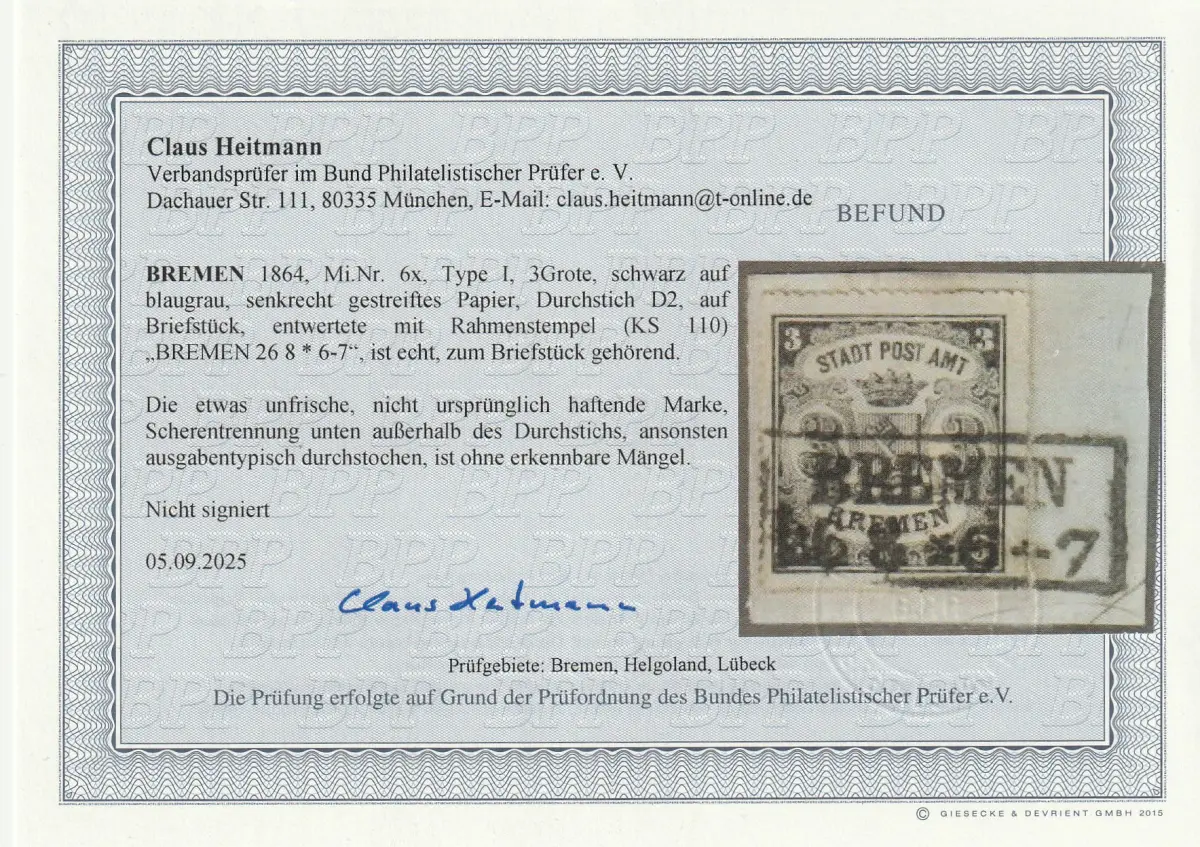 Bremen Nr. 6x, Briefstück, BPP-Befund