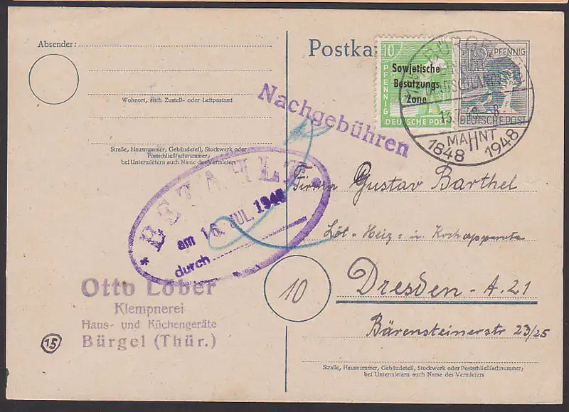 Brgel (Thr.) SSt. Einheit Deutshland mit Nachgebühr, da 1 Pfg. fehlte, 10-Fach mit SBZ-Aufdruck 13.7.48