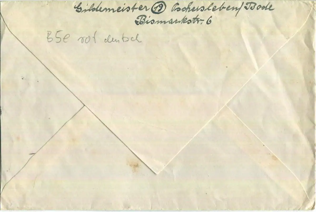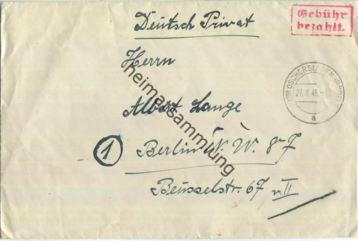 Brief aus (19) Oschersleben vom 21.08.1945 mit 'Gebühr bezahlt.' Stempel B5e in rot