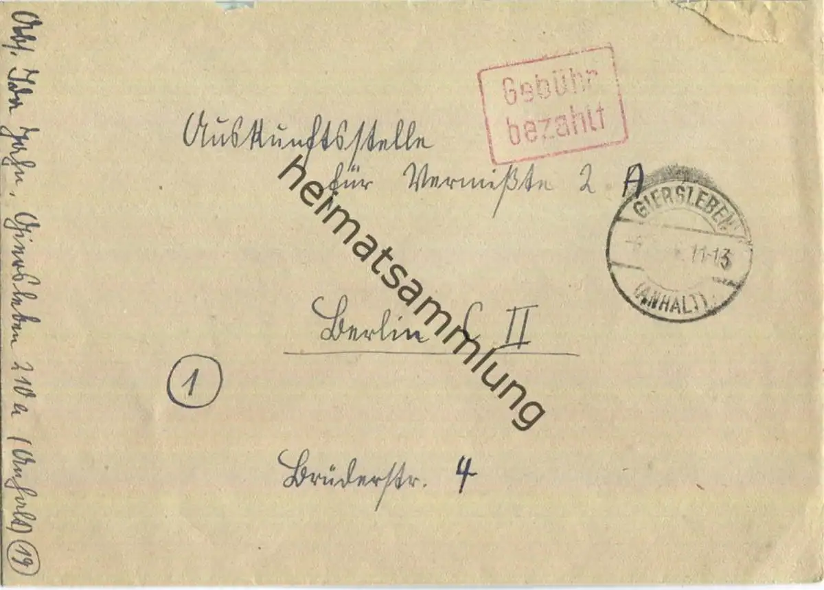 Brief aus Giersleben (Anhalt) von 1946 mit 'Gebühr bezahlt' Stempel B5a in rot