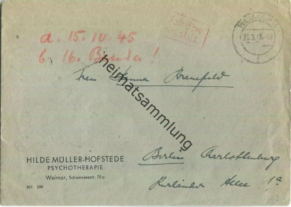 Brief aus Weimar vom 21.09.1945 mit 'Gebühr bezahlt' Stempel B5a in rot (G50511)