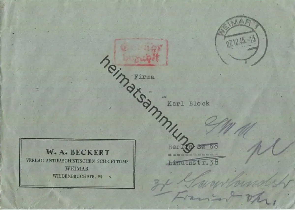Brief aus Weimar vom 27.12.1945 mit 'Gebühr bezahlt' Stempel B5a in rot - Weiterleitung