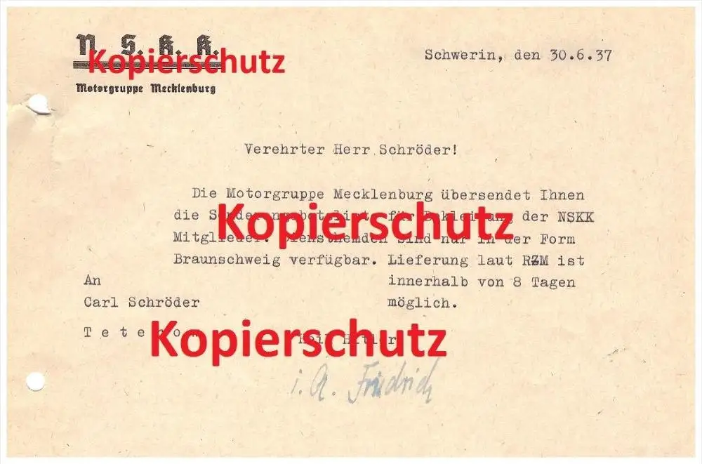Brief der NSKK Motorgruppe Mecklenburg an Carl Schröder ,